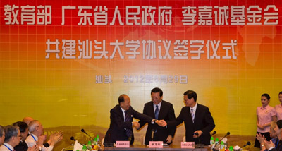 (Shantou and Hong Kong, 29 June 2012) Shantou University ("STU") marked a new milestone today, with the Ministry of Education, the Guangdong Provincial Government and the Li Ka Shing Foundation signing a tripartite agreement to co-develop STU. The agreement was reached to support STU's continuing reform efforts and to expedite its development as an experimental model for reforms in higher education. The agreement outlines the strong financial and policy support from the Ministry of Education and the Guangdong Provincial Government. STU will be granted a unique status as a national model for education reforms. The Foundation will continue to support STU, leveraging its partnerships with leading universities around the world to assist STU to become an internationally renowned elite mainland university with unique characteristics.