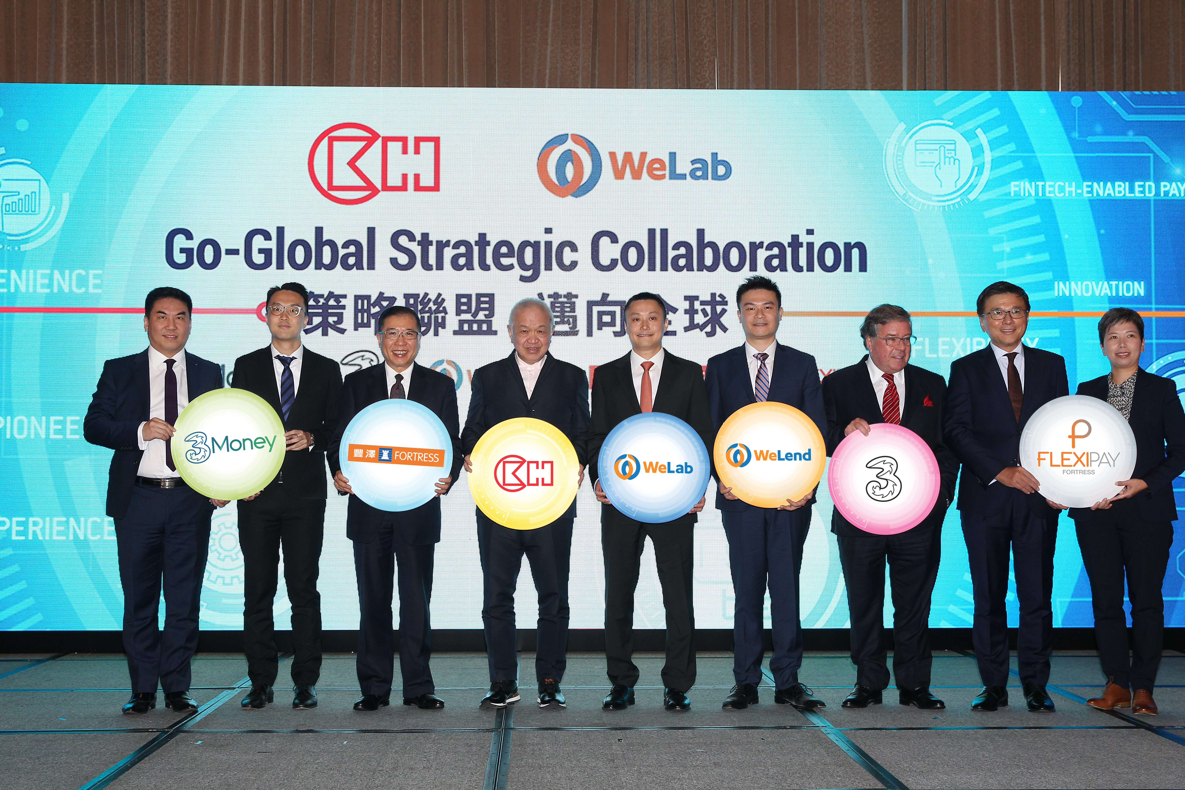 From left: Mr. Kenny Koo, Hutchison Telecommunications Hong Kong Executive Director and Chief Executive Officer; Mr. Tat Lee, WeLab General Manager (Hong Kong); Mr. Dominic Lai, CK Hutchison Deputy Managing Director and AS Watson Group Managing Director; Mr. Canning Fok, CK Hutchison Group Co-Managing Director; Mr. Simon Loong, WeLab Founder and Chief Executive Officer; Mr. Kelly Wong, WeLab Co-founder and Chief Operating Officer; Mr. Frank Sixt, CK Hutchison Group Finance Director and Deputy Managing Director; Mr. KC Chan, WeLab Senior Advisor and Ms. Clarice Au, Fortress Managing Director at the CK Hutchison and WeLab Go-Global Strategic Collaboration ceremony.